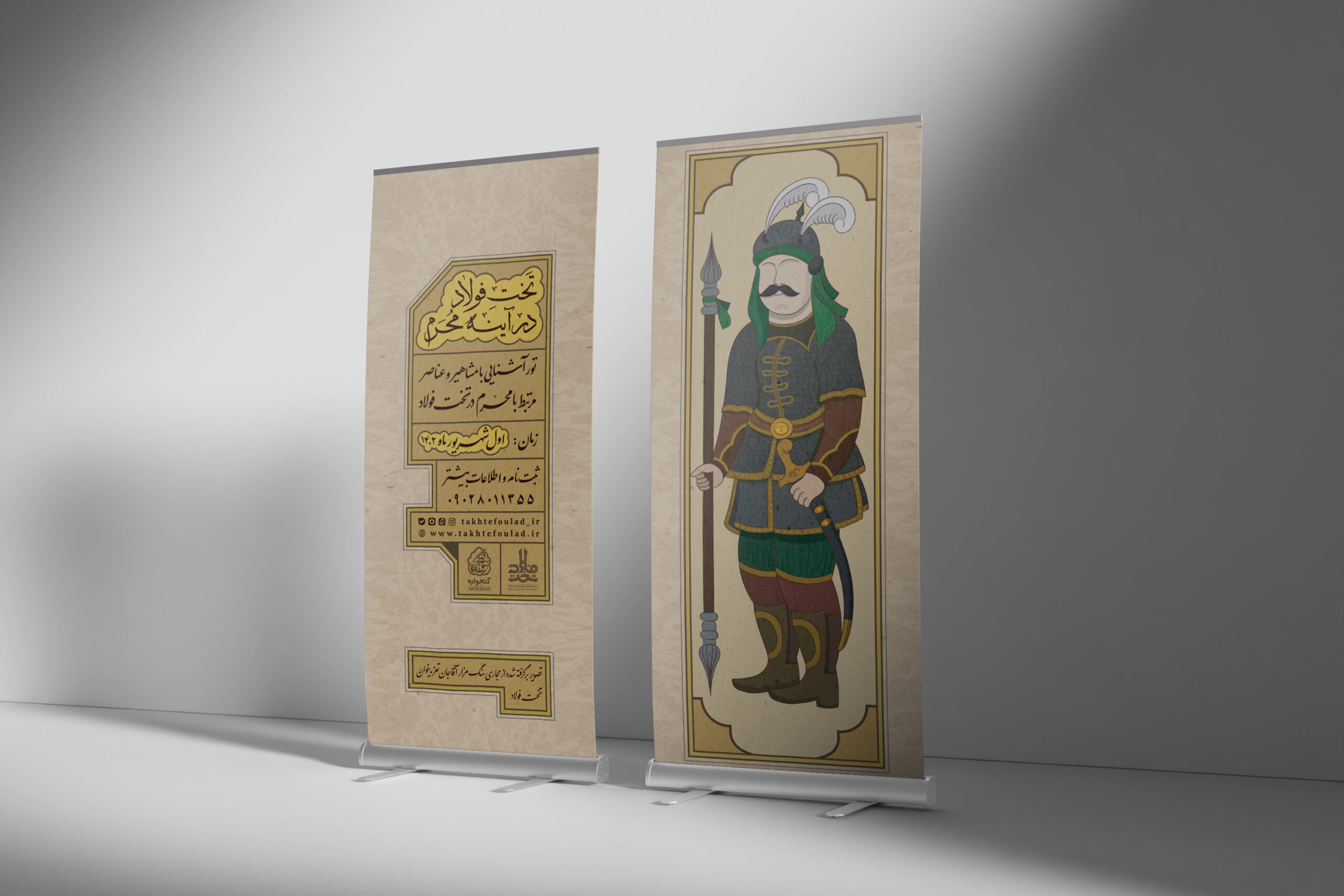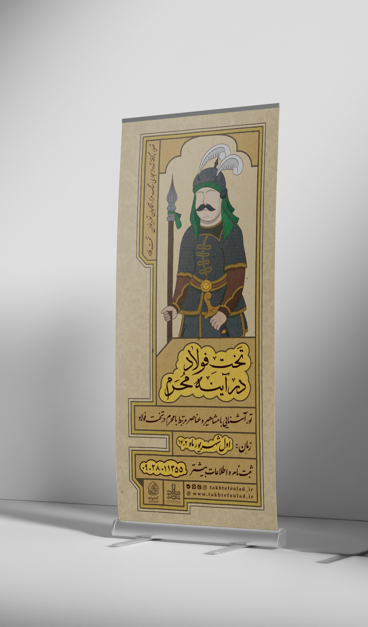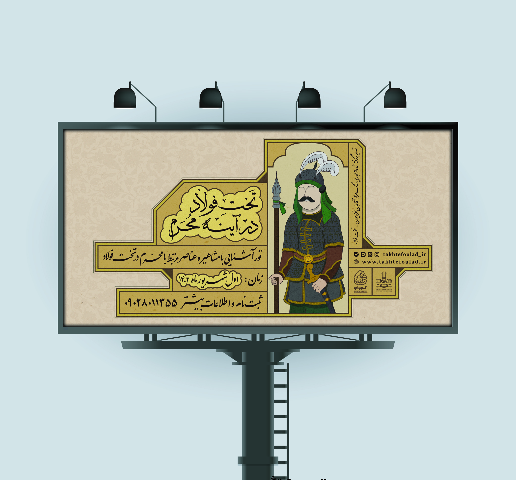 طراحی پوستر، استند، بیلبورد و کارت دعوت تور تخت فولادر در آینه محرم